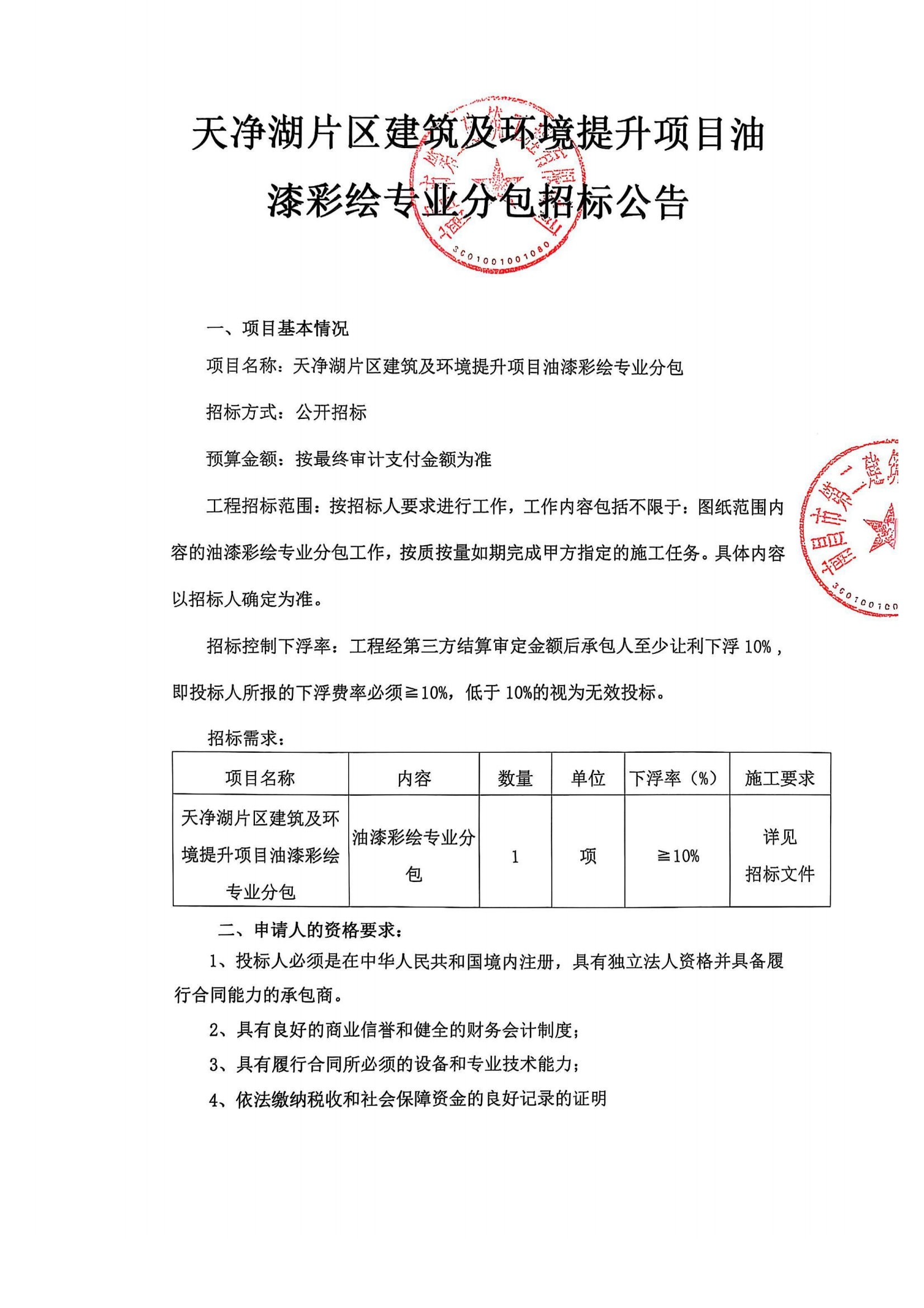 天凈湖片區建筑及環境提升項目油漆彩繪專業分包招標公告